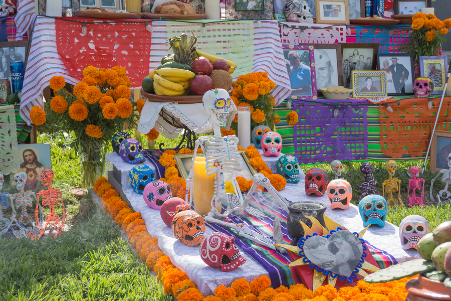 Whilst The Day of the Dead is celebrated in most Hispanic countries, Mexico is famous for its celebrations during the festival. It is a jubilant festival that remembers and celebrates the lives of dead friends and family, rather than mourning their loss. The festival begins on All Hallows Eve on the 31st October, when the souls of the dead are thought to return home. Families light candles and incense to help the spirits find their way. Relatives will make alters in their homes – called ofrendas – and decorate them with pictures of their deceased loved ones, as well as flowers, sweets and the person’s favourite foods and drink. Families might also place water and towels out, for the soul to wash when they arrive.
